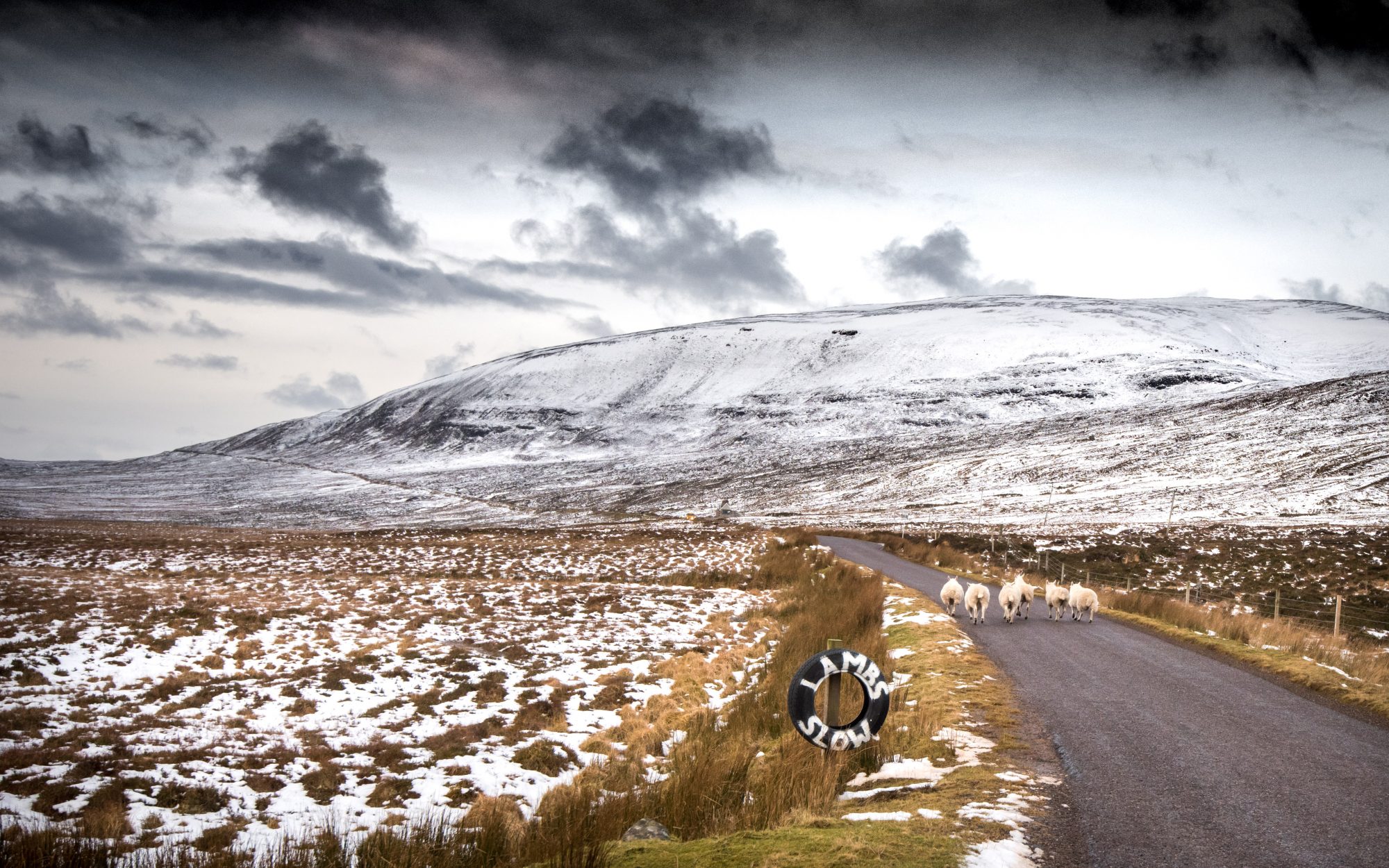 Au nord des Highlands, il y a tellement peu de voitures en hiver, que les panneaux ont l’air de s’adresser aux moutons.